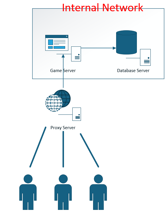 Proxy server is configured and running. It connects to the game server using an internal network connection. Game client connects to the proxy server which relays to the game server successfully.